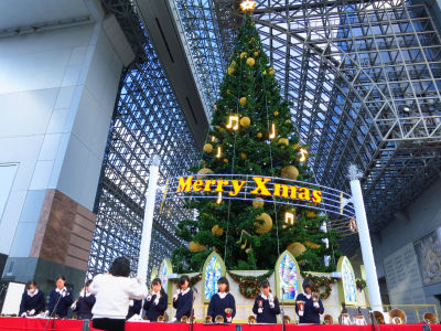 京都駅のでかいツリーの下で演奏してました。